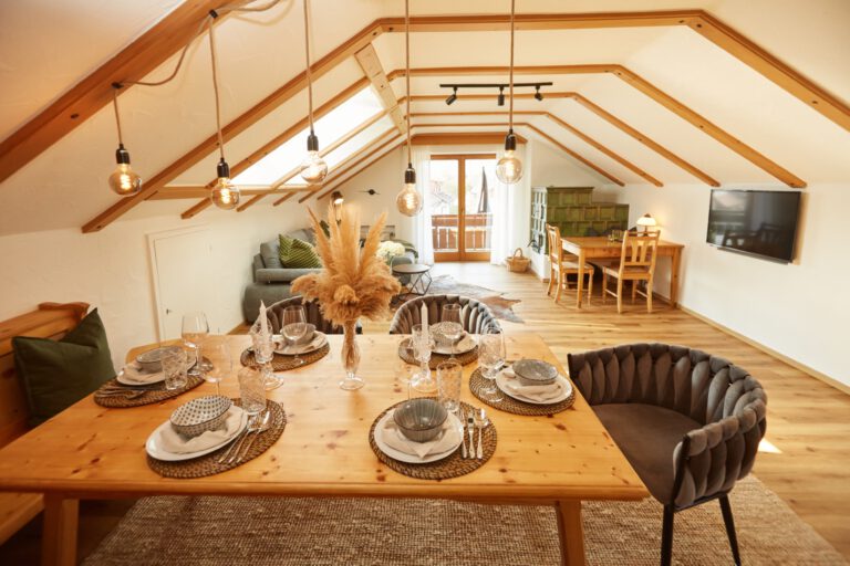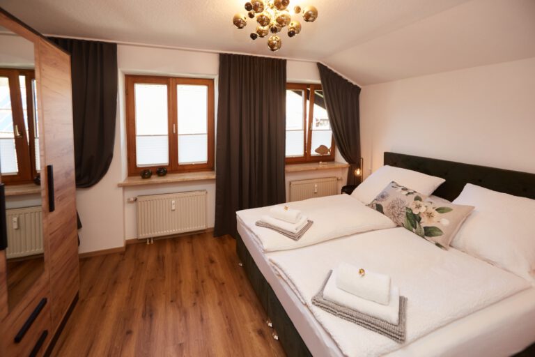 Die 90 m² große, im alpinen Lifestyle eingerichtete Dachgeschosswohnung bietet mit seinen zwei Schlafzimmern mit Kingsize Boxbetten und einer gemütlichen Couch Platz für 4 Personen plus einem Kleinkind bis zu 3 Jahren, für welches wir auf Anfrage ein Reisebettchen und einen Hochstuhl gegen eine einmalige Gebühr von 20 EUR zur Verfügung stellen.